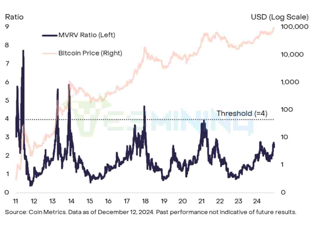 1,MVRV Ratio: This ratio measures Bitcoin’s market value relative to its realized value. Currently, at 2.6, it’s still below previous cycle peaks, indicating potential for further price growth.,