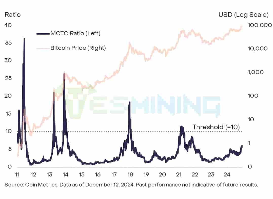 3,MCTC Ratio: The ratio of miner asset value to cumulative issuance value is currently around 6, suggesting there’s still room for growth compared to previous cycle peaks.