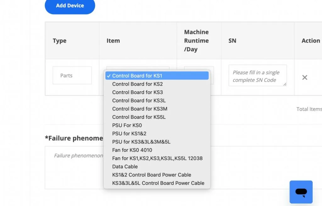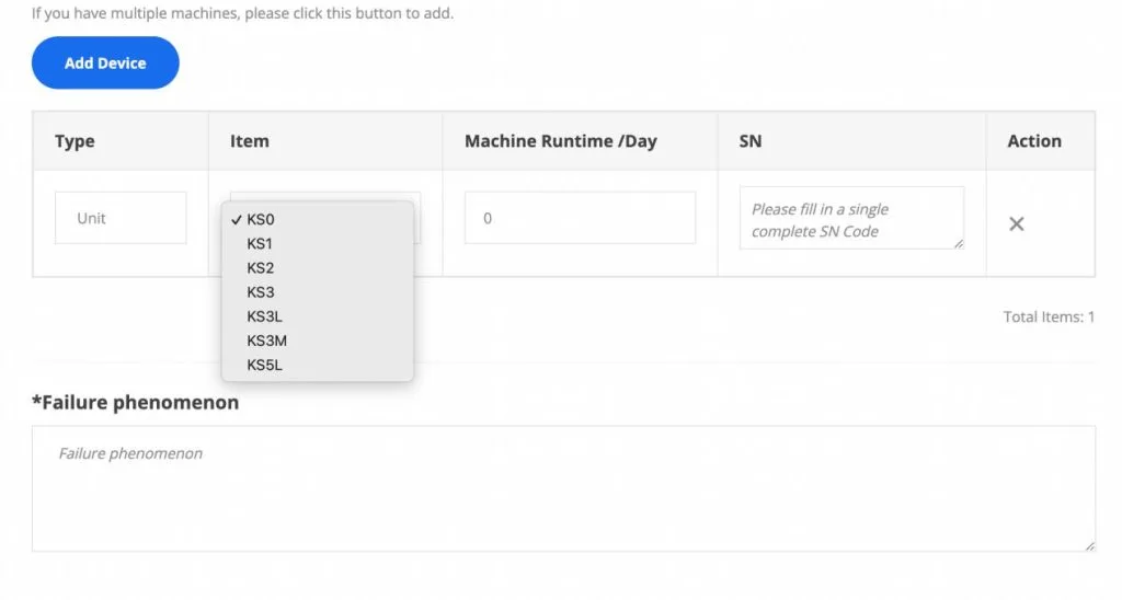 3. Click “Add Device” to fill in the Device information of your ice river KS5L ( like Unit, KS5L, Operating time, SN). If more than one miner has problems, you can continue to click “Add Device”.