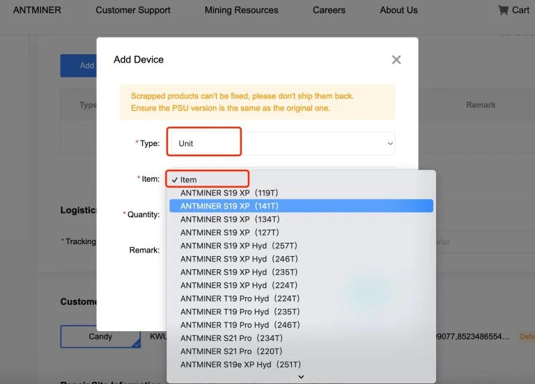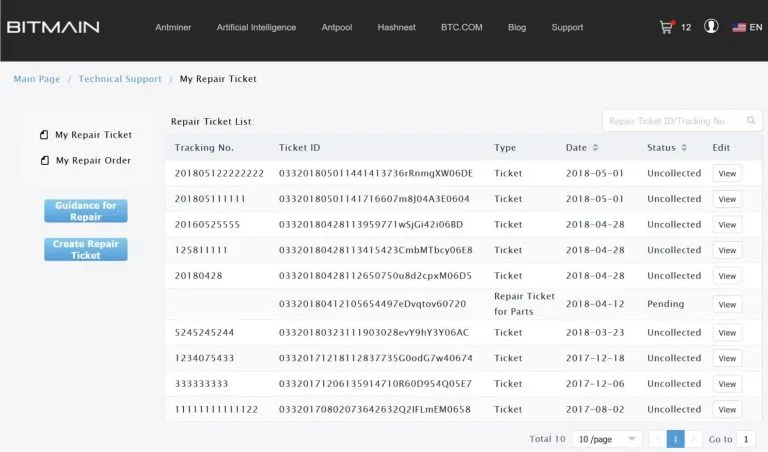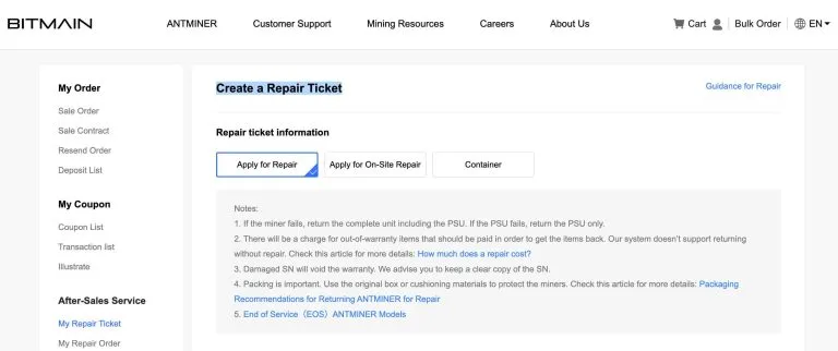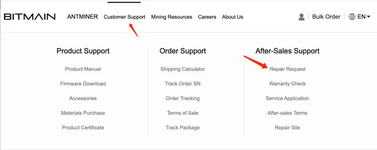 Посетите официальный сайт BITMAIN (www.bitmain.com), нажмите на «поддержка клиентов» в верхней части страницы и выберите «заявка на ремонт».